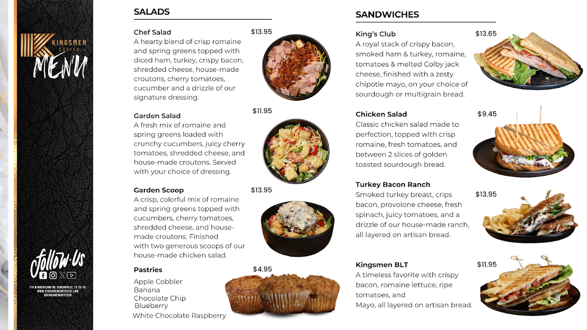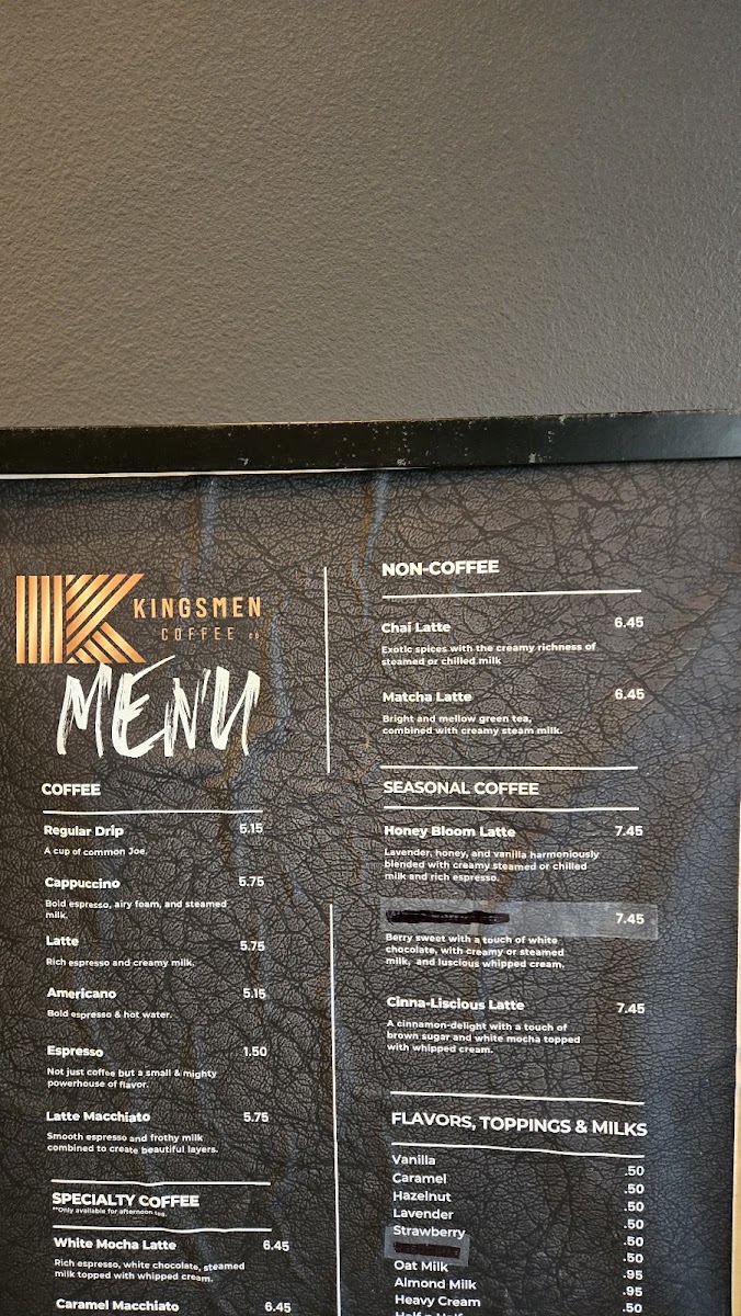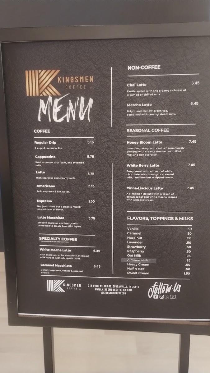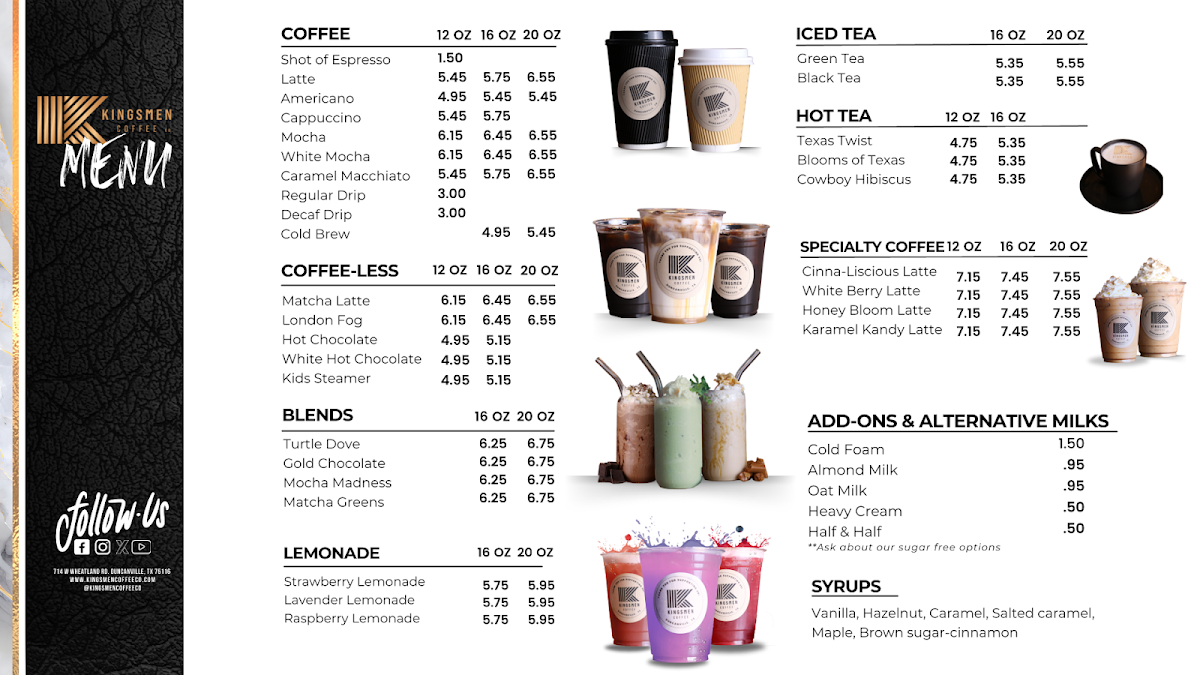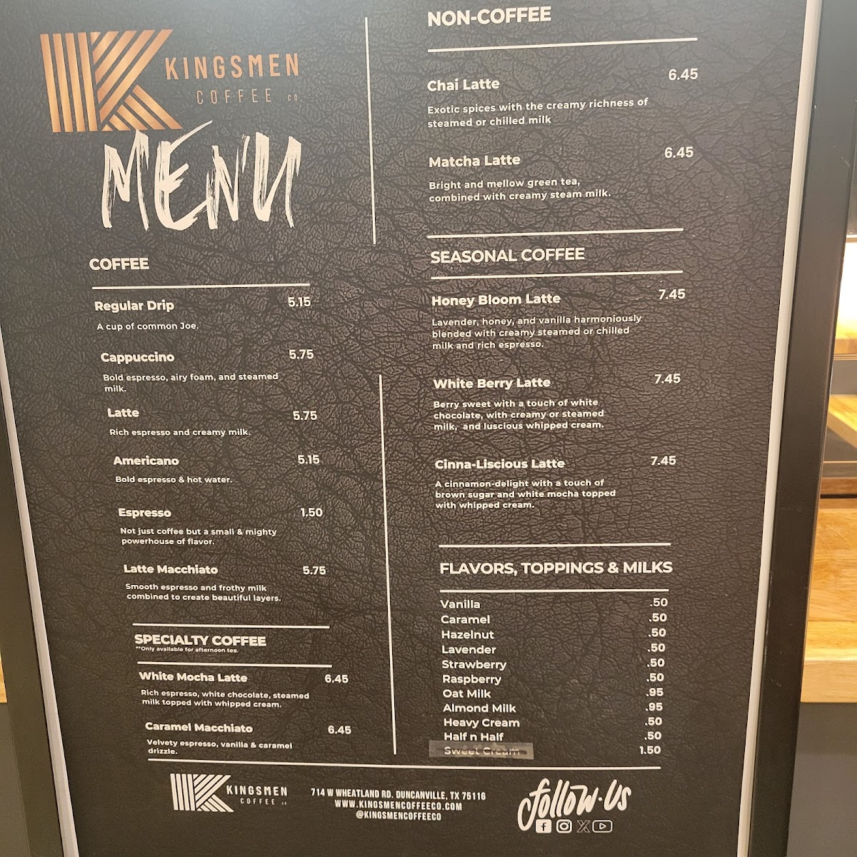 At Kingsmen Coffee Menu, you’ll discover a delightful range of drinks and bites to satisfy every coffee lover’s cravings. Whether you’re stopping by for a quick espresso or a cozy cappuccino, the inviting atmosphere sets the perfect stage to enjoy your favorite brew. Start with one of their rich, expertly crafted coffee options - from a smooth cold brew to a decadent caramel macchiato, each cup promises quality and flavor. If you're in the mood for something a little different, their selection of teas and fresh pastries provides the ideal pairing. For those looking to indulge, there are specialty drinks that will surely catch your attention. No matter what you choose, Kingsmen Coffee creates a warm, welcoming space where every visit feels like a treat.